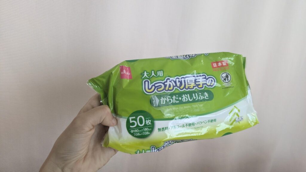 「なんでおしりふき?」と思うかもしれません。大判のノンアルコールウエットティッシュでも良いです。ベッドから自由に動けないと、手を洗いに行ったり朝起きて顔を洗ったりが面倒だったりします。そんな時にノンアルコールウエットティッシュが活躍します。ノンアルコールとしたのは、無香料でノンアルコールの方が汎用性が高いからです。テーブルやコップ、顔、風呂に入れない時デリケートゾーンまで拭けます。「おしりふき」としたのは「大判」「厚手」「枚数が多い」「安価」だからです。ドラッグストアや100円ショップにもありますが、ウエットティッシュの並びではなく「介護用品コーナー」にあったりするのでご注意を。大丈夫です、ネーミングに目を瞑れば顔も拭けますよ★