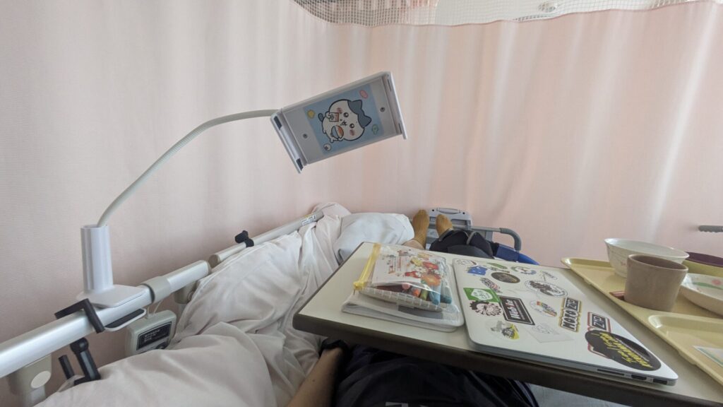 ここからが自分の入院生活での知見多めです。外科入院の場合、痛みや行動制限以外の意識は割と元気なので「ストレスを減らすもの」「気を紛らわせる」手段が複数あるといいなと思います。腕や足を固定されて身動きが取れない時間が長い…なんて時に、ちょっとした娯楽が精神を救ってくれますよ!!(実体験)