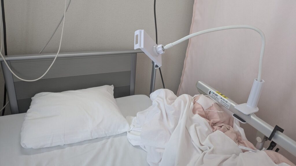 私はもうこれなしで入院できないです。テーブルやベッドの手すりにスマホアームをつけて、寝たきりでも顔面にスマホを落とす心配なくテレビ通話(個室でない場合は通常デイルームでの通話です。許可を得ましょう)したり、日課の英語勉強アプリを開いたり、映画を観たりできます。