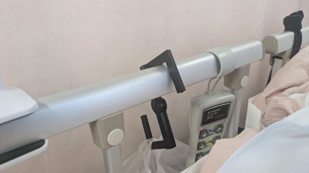 ベッドからあまり動けない時、近い手すりに「よく使うもの」を入れた袋をかけて置けます。一つあると地味に便利。
