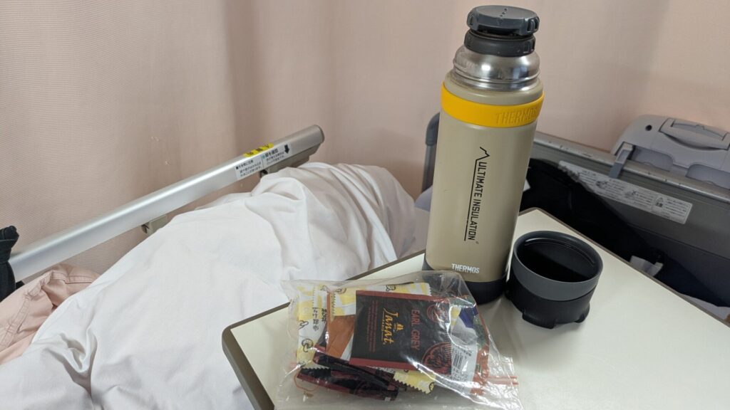 ベッドにお湯や水があるといろいろ便利。院内コンビニでカップ麺を買ったりした時や…この後記述しますが、喉が渇いた時、リラックスしたい時に。火傷はしないように!私は登山で使っていたサーモス山専(750ml)を使っています。