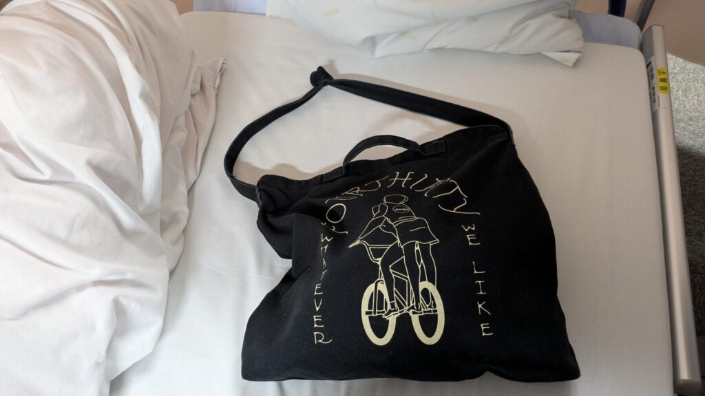 シャワー室やデイルームに行く時、ちょっとした貴重品や着替えなどを入れて運ぶバッグがあると便利。この記事は外科入院想定なので、手や足が使えない・車椅子や松葉杖の時を想定して両手が空く&ものを取り出しやすい「斜めかけバッグ」がベスト。